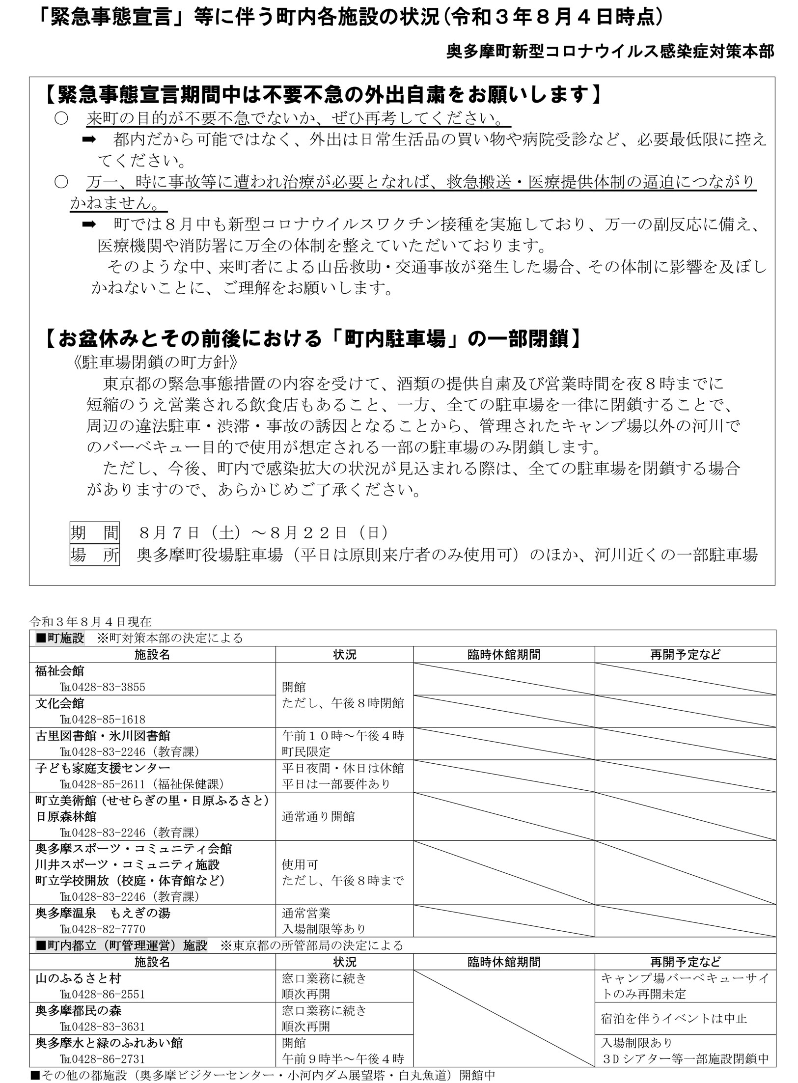 | NEW 町営小丹波駐車場・寸庭集落内・川井湖園地・雲風呂 駐車場 | 「緊急事態宣言」等に伴う町内各施設の状況(令和3年8月4日時点) |