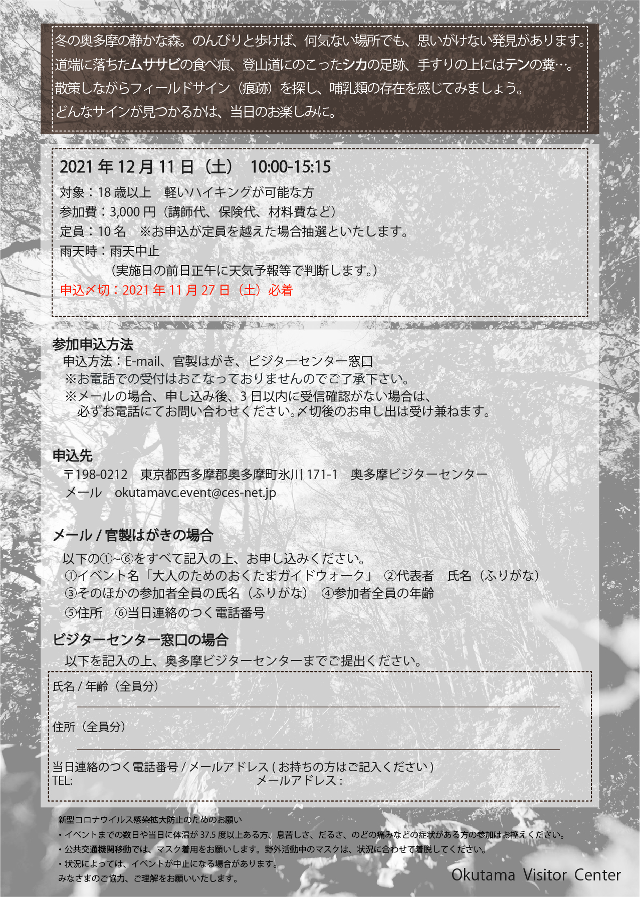 E-mail、官製はがき、奥多摩ビジターセンター窓口で申し込めます。