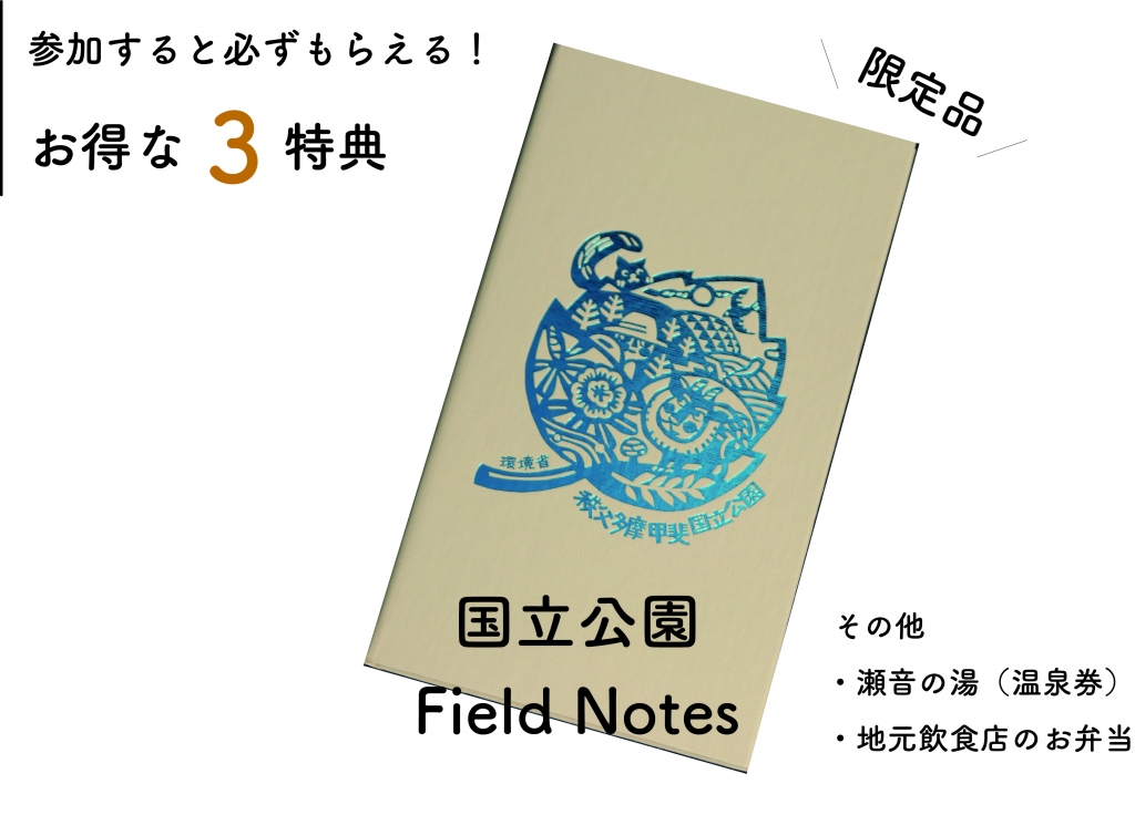 参加特典: ①国立公園Field Note ②瀬音の湯 温泉券 ③地元飲食店のお弁当