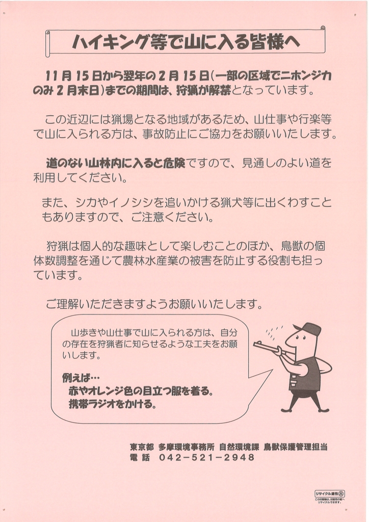 道のない山林内に入ると事故の危険がありますので、原則、登山道で見通しのよい道を通行してください。また、なるべく明るい色の服を身に付けたり、自分の存在を知らせる工夫等をお願い致します。