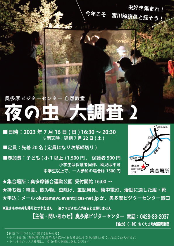 ●持ち物:軽食、飲み物、虫よけ、筆記具、ライト(懐中電灯)、野外活動に適した靴・服装、