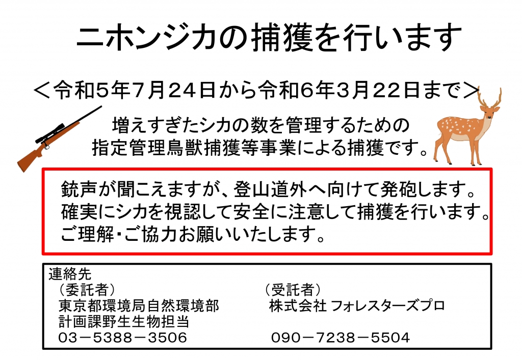 実施にあたっては、専門の業者が登山道外へ向けて発砲し、確実にシカを視認して安全に注意して捕獲を行います。