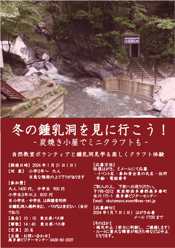 ●持ち物:動きやすい服装、防寒着(奥多摩の1月は日中8℃(冷蔵庫)くらいです)、手袋、帽子(鍾乳洞内で頭部を保護)、滑りにくく歩きやすい靴、雨具、昼食、飲み物、ライト、筆記用具、必要な方はマスク