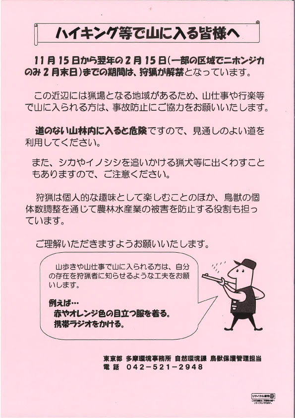 奥多摩周辺には猟場となる地域があるため、山仕事や行楽などで山に入られる方は、事故防止にご協力をお願いします。