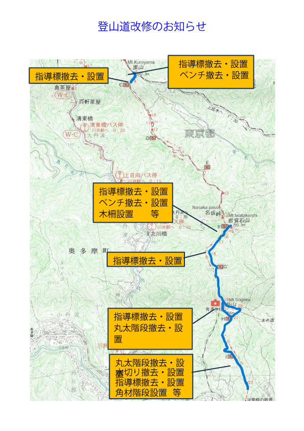 黒山、岩茸石山~惣岳山において、登山コースにあるベンチや丸太階段、指導標の劣化や登山客の安全を考慮し、より快適にご利用していただくための補修工事が行われています。