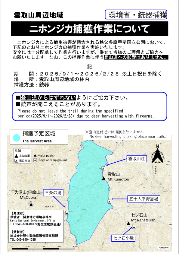 ニホンジカによる植生被害が懸念される秩父多摩甲斐国立公園において、ニホンジカの捕獲作業が実施されます。安全に十分配慮して行われ、登山道への影響はありませんが、登山道から外れないようにご協力ください。