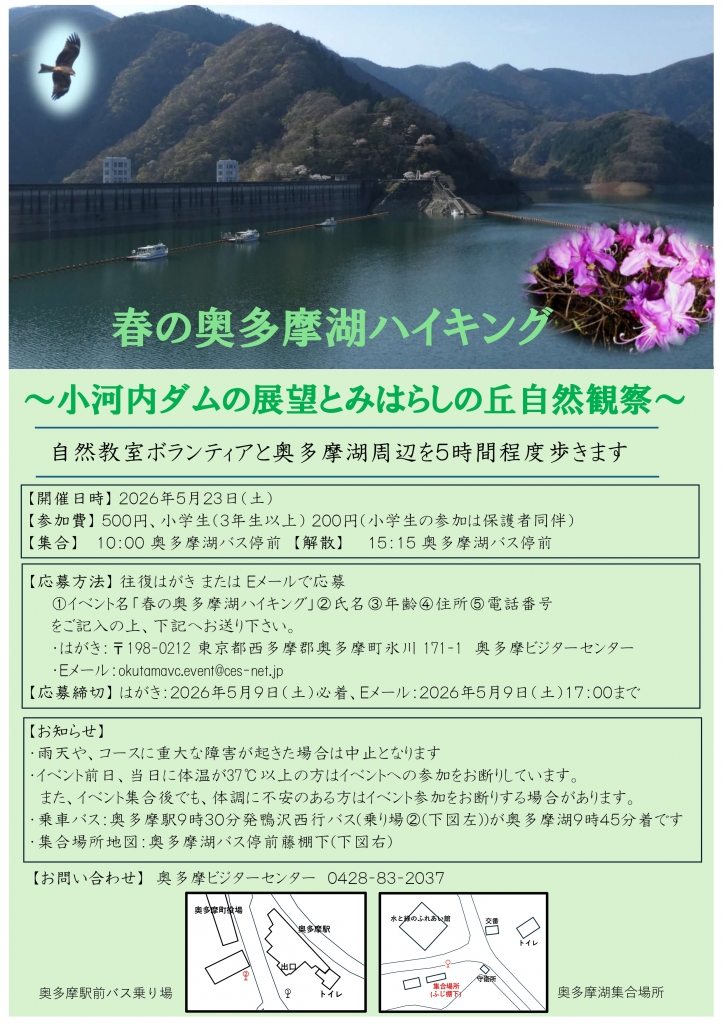 ①イベント名 自然教室 「春の奥多摩湖ハイキング~小河内ダムの展望とみはらしの丘自然観察~」