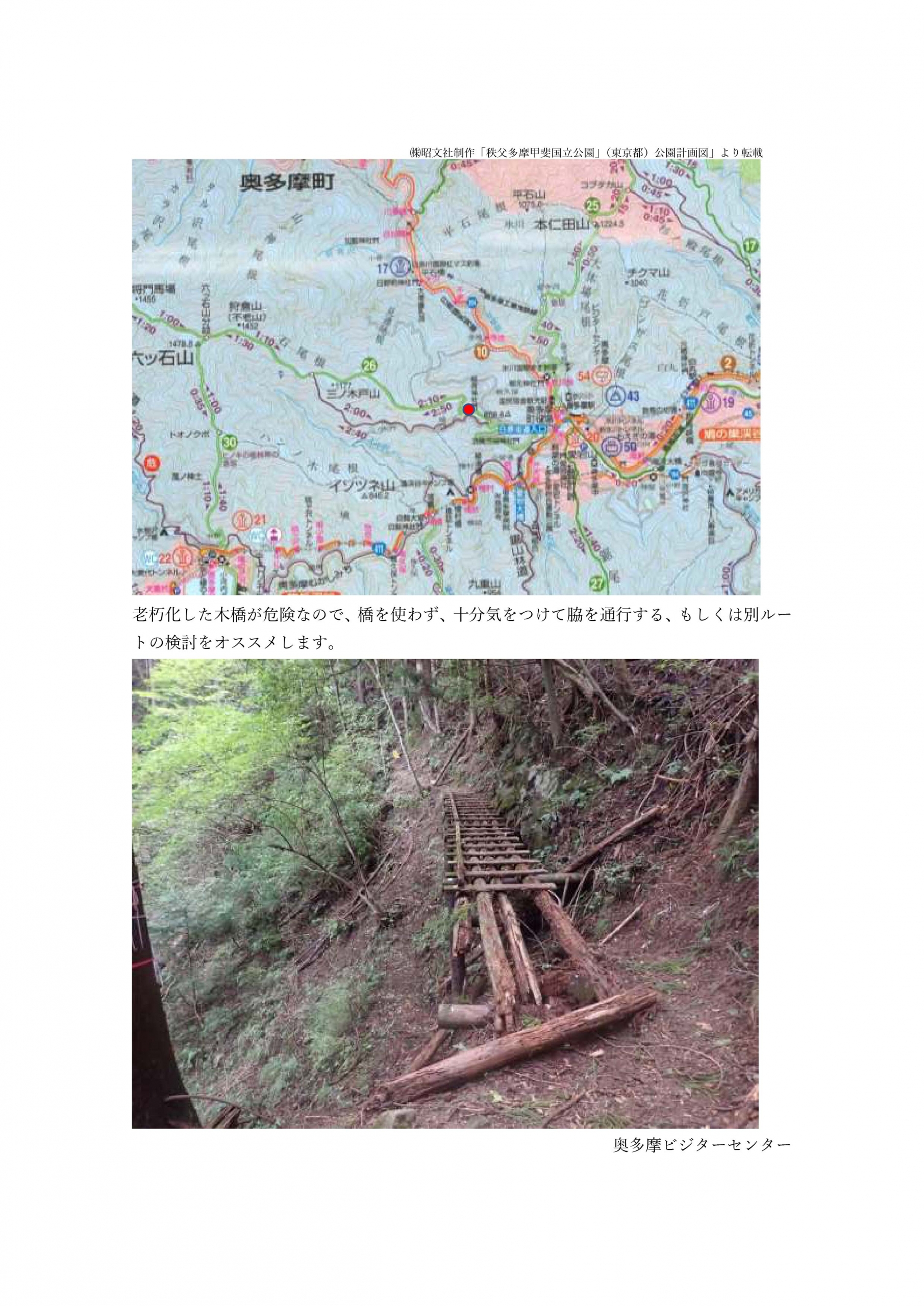 | 御前山 水辺の道通行止 都民の森HP | トチノキ広場から栃寄沢区間 | 通行止 | 木橋崩落 | 令和元年7月21日から | トチノキ広場から境橋の区間は林道をご利用ください。 |