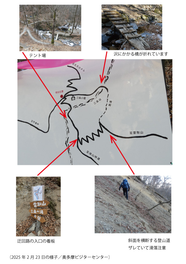 | 三条の湯 | 三条の湯~サオラ峠 | 通行止 | 木橋故障 | 令和7年9月14日から木橋が崩落しており、通行できないとのこと。詳細は丹波山村HPをご覧ください。 | |