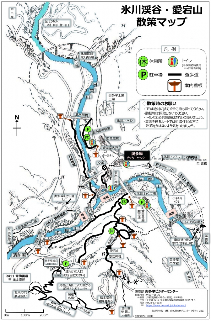 ビジターセンター最寄の氷川渓谷を中心としたハイキングコースです。裏面は奥多摩駅周辺の施設情報(観光施設、店舗など)です。